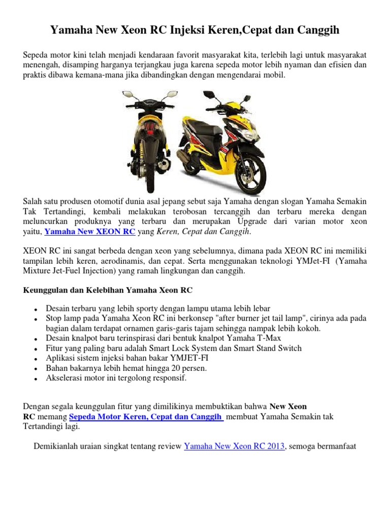 Motor yamaha xeon rc seiring berjalannya waktu perkembangan industri otomotif memang tidak pernah padam dan bahkan semakin mengalami kemajuan yang sangat pesat menyusul hadirnya teknologi teknologi terbaru yang dibawa pada setiap produk sepeda motor terbaru saat ini. Ditambah dengan penggunaan striping motor yang memberikan kesan lebih modern dan juga elegan. Dari sekian banyak jenis dan tipe sepeda motor terbaru yang membawa banyak keunggulan dalam hal teknologi salah satunya.